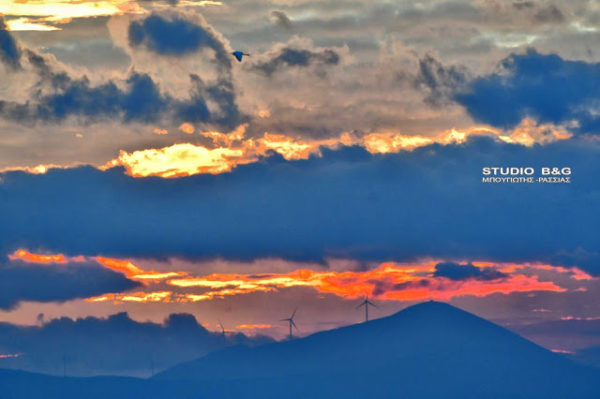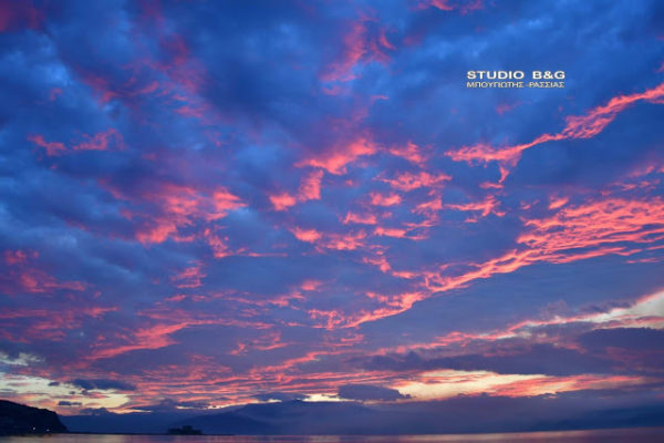 Ένα παιχνίδι ανάμεσα στις τελευταίες ηλιαχτίδες της ημέρας και τα σύννεφα πάνω από την πόλη του Ναυπλίου δημιούργησαν φανταστικές εικόνες γεμάτες πολύ χρώμα στον ουρανό κατά το Σάββατο 8 Δεκεμβρίου 2018.
