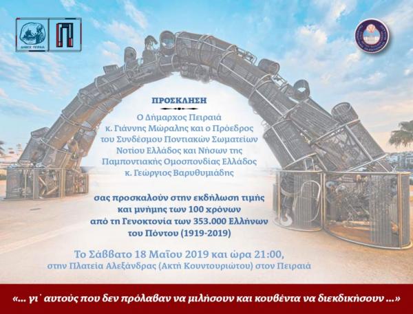 Εκδήλωση μνήμης για τα 100 χρόνια από την γενοκτονία των Ποντίων πραγματοποιείται το Σάββατο 18 Μαΐου στις 21:00, στο Μνημείο Γενοκτονίας Ελλήνων Πόντου στην πλατεία Αλεξάνδρας (Ακτή Κουντουριώτου) στον Πειραιά.