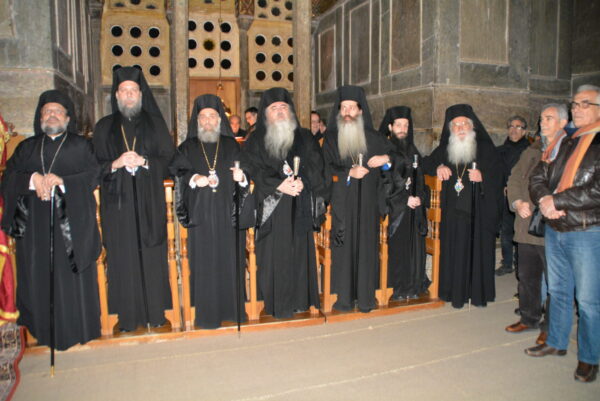 Στον Εσπερινό χοροστάτησε o Θεοφιλέστατος Επίσκοπος Ωρεών κ. Φιλόθεος συγχοροστατούντων των Σεβασμιωτάτων Μητροπολιτών Αλεξανδρουπόλεως κ. Ανθίμου, Μεσσηνίας κ. Χρυσοστόμου, Φωκίδος κ. Θεοκτίστου, Νέας Ιωνίας και Φιλαδελφείας κ. Γαβριήλ, Θεσσαλιώτιδος και Φαναριοφερσάλων κ. Τιμοθέου, Νέας Κρήνης και Καλαμαριάς κ. Ιουστίνου, Φθιώτιδος κ. Συμεών, Σισανίου και Σιατίστης κ. Αθανασίου και Θηβών και Λεβαδείας κ. Γεωργίου.