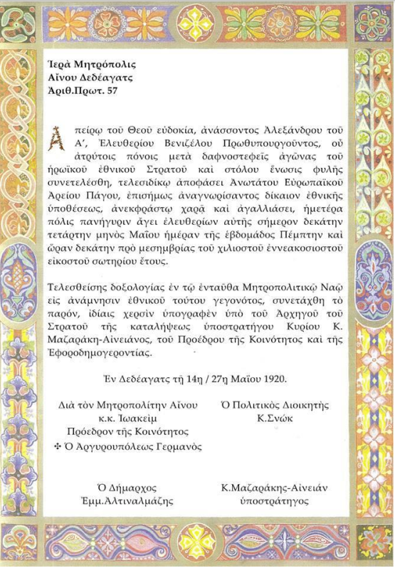 Τελεσθείσης δοξολογίας εν τω ενταύθα ΜητροπολιτικώΝαώείςανάµνησιν εθνικού τούτου γεγονότος, συνετάχθη το παρόν, ιδίαιςχερσίνύπογραφένύπο του Αρχηγού του Στρατού τής καταλήψεως ύποστρατήγου Κυρίου Κ. Μαζαράκη – Αίνειάνος, του Προέδρου της Κοινότητος και της Εφοροδημογεροντίας.