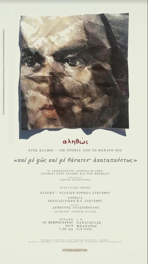 Το Μορφωτικό Κέντρο Λόγου “Αληθώς” έχει την τιμή να αφιερώσει την 4η εκδήλωση του η΄ κύκλου δράσεών του στον Ζακύνθιο και μέγα “Φιλόπατρι” Ποιητή ΑΝΔΡΕΑ ΚΑΛΒΟ-ΙΩΑΝΝΙΔΗ(1792-1869), με την ευκαιρία της συμπλήρωσης, κατά το τρέχον έτος, 150 χρόνων από τον θάνατό του και με γενικό τίτλο, τους στίχους του ίδιου: “και με φως και με θάνατον ακαταπαύστως”.