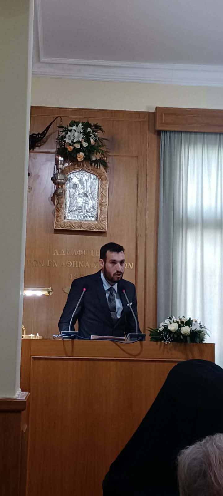 Ακολούθως, στην αίθουσα της Αδελφότητος πραγματοποιήθηκε σύντομη Πνευματική Πολιτιστική Εκδήλωση, την έναρξη της οποίας κήρυξε ο Πρόεδρος της Αδελφότητος κ. Εμμανουήλ Σκαρής και χαιρετισμό απηύθυναν ο εκπρόσωπος του Μακαριωτάτου κ. Ιερωνύμου Β’ Πανοσιολ. Αρχιμ. Δωρόθεος Κιούσης, καθώς και άλλοι επίσημοι.