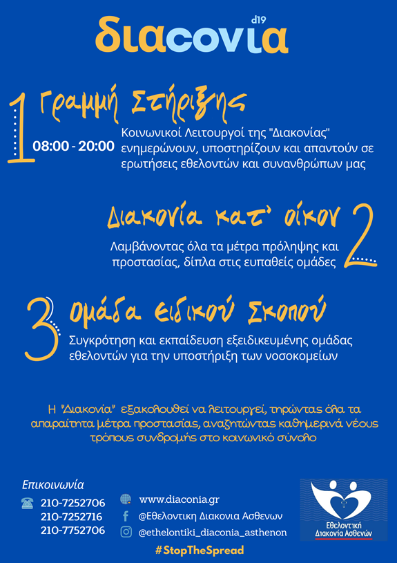 Πάντα δίπλα σε όσους έχουν ανάγκη, ευχαριστούμε κάθε έναν ξεχωριστά του Μεγάλους Ήρωες, τους Εθελοντές μας, αλλά και όσουν ανήκουν και στηρίζουν τη μεγάλη οικογένεια της “Διακονίας”! Διαρκής στόχος μας είναι η Εθελοντική Διακονία Ασθενών να αποτελέσει φάρο ευαισθητοποίησης στο πνεύμα και τις αρχές του εθελοντισμού και στη φροντίδα των μοναχικών και εγκαταλελειμμένων συνανθρώπων μας” αναφέρεται στη σχετική ανακοίνωση.