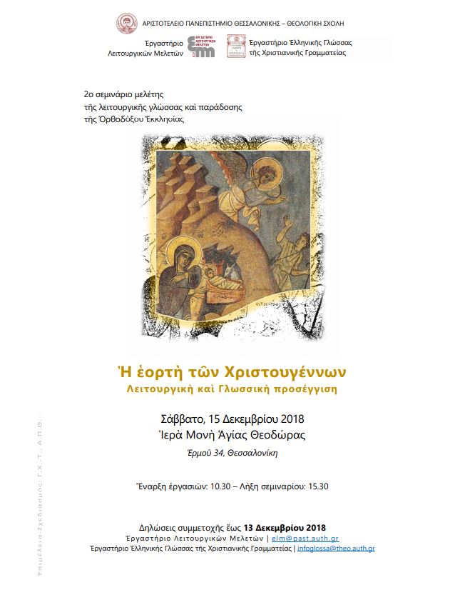 Το Εργαστήριο ΕΛΛΗΝΙΚΗΣ ΓΛΩΣΣΑΣ ΤΗΣ ΧΡΙΣΤΙΑΝΙΚΗΣ ΓΡΑΜΜΑΤΕΙΑΣ (Τμήμα Θεολογίας) και το Εργαστήριο ΛΕΙΤΟΥΡΓΙΚΩΝ ΜΕΛΕΤΩΝ (Τμήμα Ποιμαντικής και Κοινωνικής Θεολογίας) της Θεολογικής Σχολής του ΑΠΘ πραγματοποιούν σειρά εκπαιδευτικών Σεμιναρίων που στοχεύουν στη μελέτη και ανάδειξη της λειτουργικής γλώσσας και παράδοσης της Ορθοδόξου Εκκλησίας.