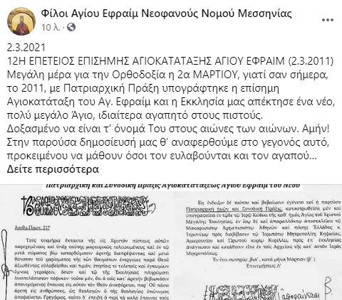 02/03/2021 02/03/2021 Μεγάλη μέρα για την Ορθοδοξία η 2α ΜΑΡΤΙΟΥ, γιατί σαν σήμερα, το 2011, με Πατριαρχική Πράξη υπογράφτηκε η επίσημη Αγιοκατάταξη του Αγίου Εφραίμ του Όρους των Αμώμων (Νέας Μάκρης) και η Εκκλησία μας απέκτησε ένα νέο, πολύ μεγάλο Άγιο, ιδιαίτερα αγαπητό στους πιστούς παγκοσμίως. Οι Φίλοι του Αγίου Εφραίμ από τον Νομό Μεσσηνίας αναρτούν επί...