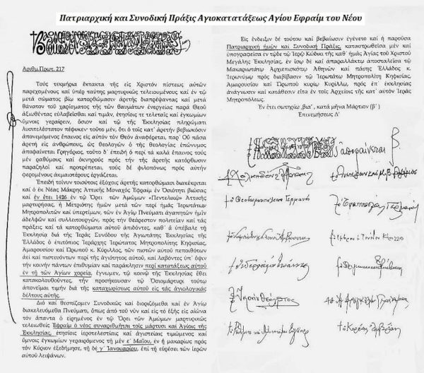 Οι Φίλοι του Αγίου Εφραίμ από τον Νομό Μεσσηνίας αναρτούν επί τούτω την Πατριαρχική και Συνοδική Πράξη της Αγιοκατατάξεως: