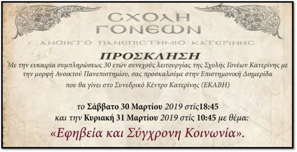 Η Σχολή Γονέων Ανοικτού Πανεπιστημίου Κατερίνης, μάς προσκαλεί με μεγάλη χαρά στο Διήμερο Επιστημονικό Συνέδριο που διοργανώνει για τα 30 της χρόνια, το οποίο θα πραγματοποιηθεί στο Συνεδριακό Κέντρο της Κατερίνης κατά το Σάββατο 30 και την Κυριακή 31 Μαρτίου 2019, με θέμα: