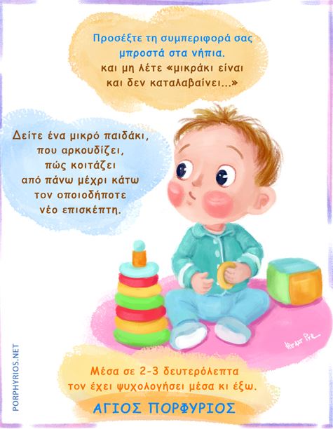 Έλεγε ο σοφός Γέροντας Πορφύριος ότι οι γονείς πρέπει να προσέχουν τη συμπεριφορά τους, ακόμη και μπροστά στα νήπια και δεν πρέπει να σκέπτονται και να λένε: «Μικράκι είναι και δεν καταλαβαίνει». Προσέξτε, έλεγε, ένα μικρό παιδάκι, που αρκουδίζει, πως κοιτάζει από πάνω μέχρι κάτω τον οποιοδήποτε νέο επισκέπτη, που θα μπει στο σπίτι. Μέσα σε χρόνο 2-3 δευτερολέπτων το μικρό αυτό παιδάκι, που εσύ δεν υπολογίζεις, έχει μελετήσει τα χαρακτηριστικά του ανθρώπου εκείνου και τον έχει ψυχολογήσει μέσα και έξω.