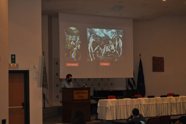 Τους μαθητές καλωσόρισε στην Μεγάλη Συνεδριακή Αίθουσα της ΟΑΚ, ο επιστημονικός συνεργάτης και βιβλιοθηκονόμος της ΟΑΚ, Ιωάννης Μουντογιαννάκης, ο οποίος αφού τους ενημέρωσε για την ιστορία και το έργο του Ιδρύματος, τους παρουσίασε μέσω οπτικοακουστικού υλικού, τη ζωή και το έργο του Δομήνικου Θεοτοκόπουλου (El Greco), τον μεγάλο ζωγράφο που κίνησε από την Κρήτη για να κατακτήσει ολάκερο τον κόσμο.