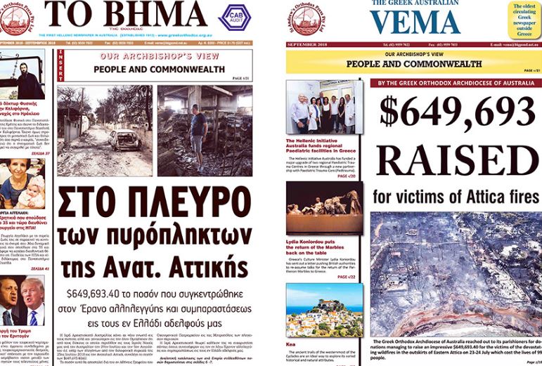 Οπως γράφει το Βήμα της Εκκλησίας της Αυστραλίας, από τους δίσκους που περιήλθαν στους Ιερούς Ναούς της χώρας την 29 Ιουλίου και την 5η Αυγούστου, υπέρ των πληγέντων από την δολοφονική πυρκαγιά της 23ης Ιουλίου στην Ανατολή Αττική, συνελέγη το ποσό των 649.693,40 δολ. Αυστραλίας