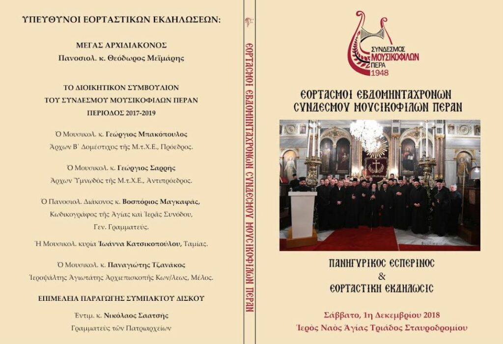 Ὡς γνωστὸν τὸ Σάββατο, 1η Δεκεμβρίου τοῦ 2018, ἑορτάσθηκε πανηγυρικῶς ἡ σημαντικὴ αὐτὴ ἐπέτειος ἀπὸ τὴν σύσταση τοῦ Συνδέσμου. Οἱ ἑορτασμοὶ περιελάμβαναν πανηγυρικὸ Ἑσπερινὸ μὲ Πατριαρχικὴ χοροστασία στὸν καλλιμάρμαρο Ἱ. Ναὸ Ἁγίας Τριάδος Σταυροδρομίου (Πέραν), ὅπου ἔψαλαν ἡ χορῳδία τοῦ Συνδέσμου Μουσικοφίλων Πέραν ὑπὸ τὴν διεύθυνση τοῦ Ἄρχοντος Πρωτοψάλτου τῆς Μ.τ.Χ.Ε., κ. Παναγιώτη Νεοχωρίτη, καὶ ὁ χορὸς τοῦ Συλλόγου τῶν ἐν Ἀθήναις Μουσικοφίλων Κωνσταντινουπόλεως, ὑπὸ τὴν διεύθυνση τοῦ Ἄρχοντος Μουσικοδιδασκάλου τῆς Μ.τ.Χ.Ε., κ. Δημοσθένη Παϊκόπουλου. Ἀκολούθησε ἀρτοκλασία, ἀλλὰ καὶ τρισάγιο ὑπὲρ ἀναπαύσεως τῶν κοιμηθέντων μελῶν καὶ στελεχῶν τοῦ ἱστορικοῦ Συνδέσμου καὶ τῆς χορῳδίας του. Αὐτὸ τὸ πρῶτο μέρος τῶν ἑορτασμῶν, μαγνητοσκο¬πημένο μὲ ἐξαιρετικὴ προσοχὴ καὶ ἀκρίβεια, φιλοξενεῖται ὁλόκληρο στὸ πρῶτο dvd ἀπὸ τὰ δύο ποὺ περιλαμβάνει ἡ κυκλοφορούμενη κασετίνα.