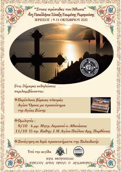 Η Ενωμένη Ρωμηοσύνη θα πραγματοποιήσει την φετινή Πανελλήνια Σύναξή της στην Ιερισσό της Χαλκιδικής στις 9-11 Οκτωβρίου 2020.