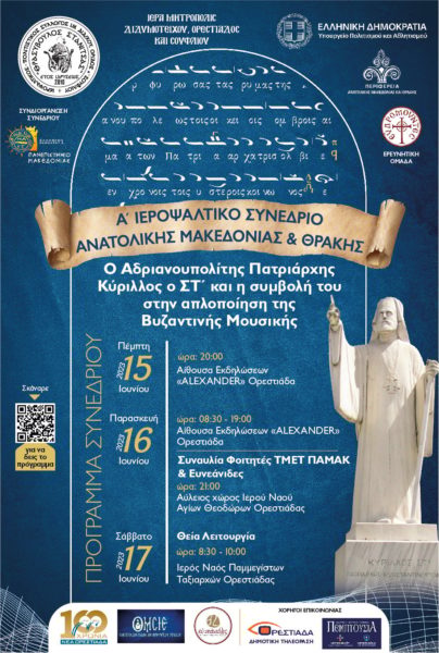 Το Α’ Ιεροψαλτικό Συνέδριο Ανατολικής Μακεδονίας και Θράκης με τίτλο «Οικουμενικός Πατριάρχης Κύριλλος ο Στ΄ ο Ανδριανουπόλεως» θα λάβει χώρα το τριήμερο 15 έως 17 Ιουνίου 2023 στην Ορεστιάδα. Συνιστά πρόταση του Ιεροψαλτικού Πολιτιστικού Συλλόγου της Ιεράς Μητροπόλεως Διδυμοτείχου, Ορεστιάδος και Σουφλίου “Θρασύβουλος Στανίτσας” και τελεί υπό την αιγίδα της Περιφέρειας Ανατολικής Μακεδονίας και Θράκης.