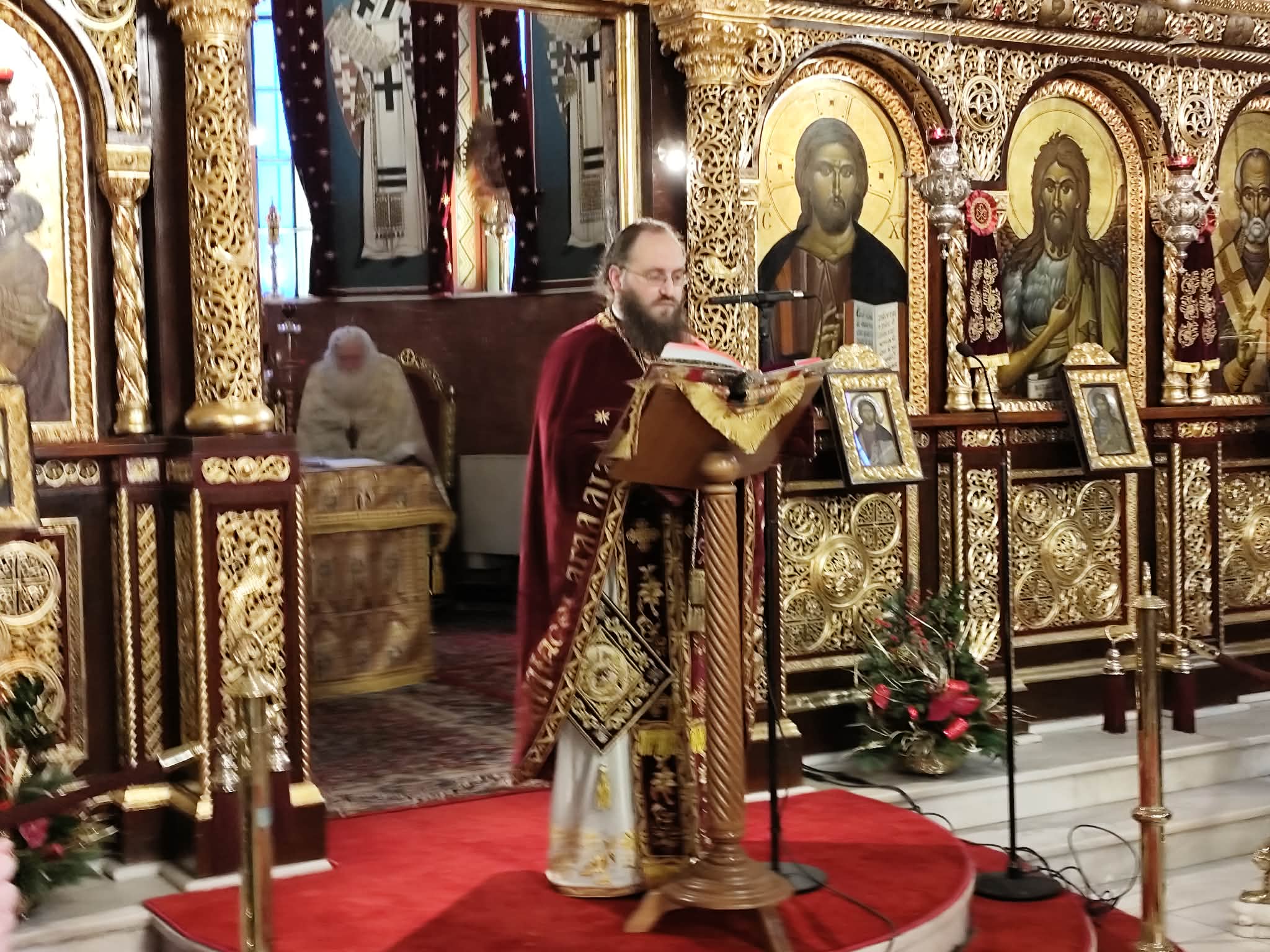 Της πανηγυρικής λειτουργίας του Μεγάλου Βασιλείου χοροστάτησε ο ο ευλαβής προϊστάμενος του ναού Αρχιμανδρίτης κος Πλάτωνας Βακαλάκης, μετά των υπολοίπων ιερέων του πατέρων κ.κ. Κίκιζα Γεωργίου, Κωνσταντέλλου Δημητρίου, Γασπαράτου Θεολόγου. Με το πέρας της λειτουργίας ο Πατέρας κ-οςΚωνσταντέλλος Δημήτριος, ανέγνωσε το ευγενές μήνυμα για το κορυφαίο γεγονός της γέννησης, του πανσέπτου Αρχιεπισκόπου Αθηνών και πάσης Ελλάδος κ.κ. Ιερωνύμου Β΄, που με ανείπωτη αγάπη και έξοχη θεολογική εμβρίθεια, εξήρε το κοσμοϊστορικό γεγονός της Γεννήσεως για την ανθρωπότητα.