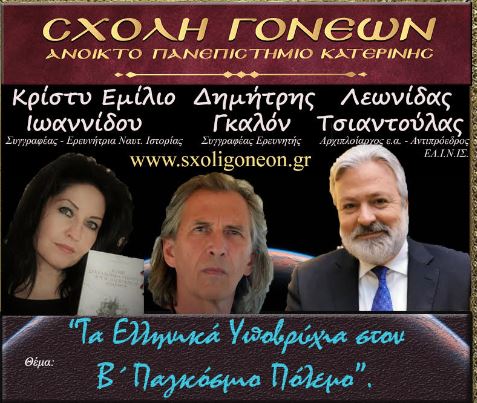 Ο Αρχιπλοίαρχος ε.α. και Αντιπρόεδρος του Ελληνικού Ινστιτούτου Ναυτικής Ιστορίας κ. Λεωνίδας Τσιαντούλας, ο Συγγραφέας – Ερευνητής κ. Δημήτρης Γκαλών και η Συγγραφέας, Ερευνήτρια Ναυτικής Ιστορίας κ. Κρίστυ Εμίλιο Ιωαννίδου είναι οι ομιλητές της εκδήλωσης της Σχολής Γονέων – Ανοικτό Πανεπιστήμιο Κατερίνης με θέμα: «Τα Ελληνικά Υποβρύχια στον Β’ Παγκόσμιο Πόλεμο» που θα πραγματοποιηθεί την Δευτέρα 6 Φεβρουαρίου 2023 και ώρα 19:00 στο Συνεδριακό Κέντρο Κατερίνης (ΕΚΑΒΗ).