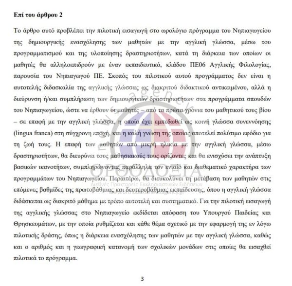 Κατά την Αιτιολογική Έκθεση επί του Άρθρου 2 του υπό διαβούλευση Νομοσχεδίου, το οποίο φιλοδοξεί  να αποτελέσει Νόμο της Ελληνικής Πολιτείας επί της πιλοτικής εισαγωγής της Αγγλικής Γλώσσας στα Νηπιαγωγεία, διαπιστώνει κανείς, για άλλη μια φορά, την επιπολαιότητα και τη σύνταξη σκεπτικού Αιτιολογικής Εκθέσεως… σε «επίπεδο νηπιαγωγείου», διότι, πως αλλιώς, να θεωρήσει κανείς το επιχείρημα της Αιτιολογικής Εκθέσεως, ότι οι μαθητές του Νηπιαγωγείου θα πρέπει από τα πρώτα χρόνια του μαθητικού τους βίου να έρθουν σε επαφή με την αγγλική γλώσσα, η οποία έχει εμπεδωθεί ως κοινή γλώσσα συνεννόησης (lingua franca) στη σύγχρονη εποχή, και άρα η καλή γνώση της αποτελεί πολύτιμο εφόδιο για τη ζωή τους;
