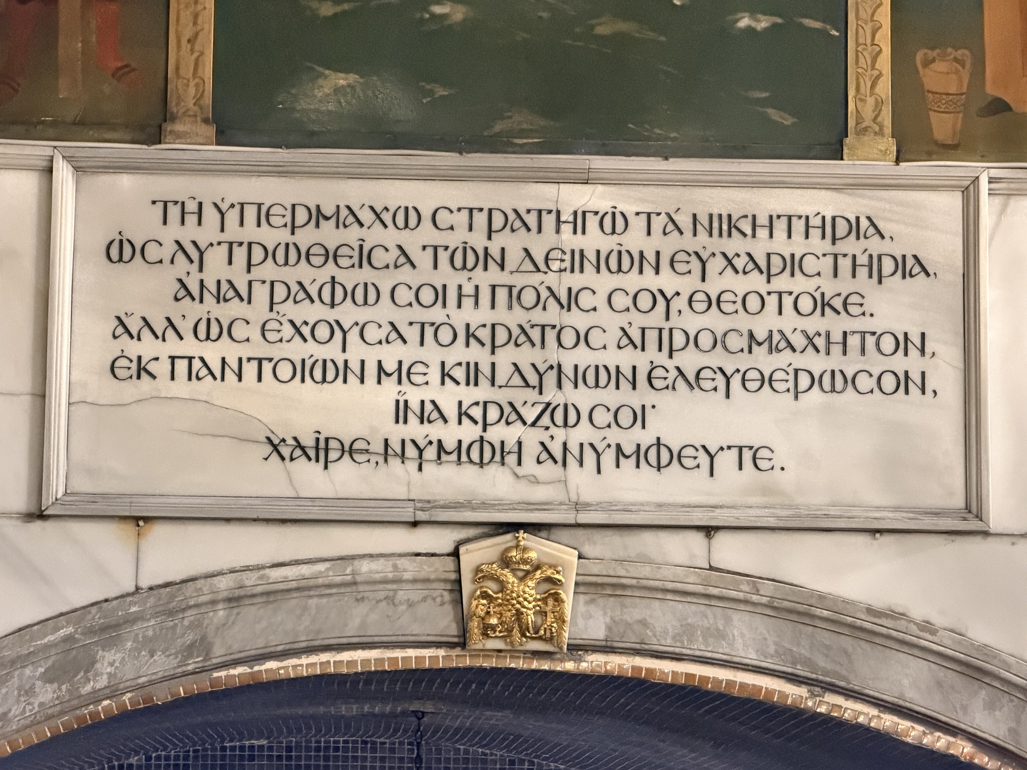 «Τῇ Ὑπερμάχῳ Στρατηγῷ τὰ νικητήρια, ὡς λυτρωθεῖσα τῶν δεινῶν, εὐχαριστήρια ἀναγράφω Σοι ἡ Πόλις Σου, Θεοτόκε!»