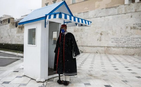 Τα χιόνια έφτασαν μέχρι το κέντρο της Αθήνας και οι εύζωνες στο Μνημείο του Άγνωστου Στρατιώτη φόρεσαν τις μπλε σκούρες τσόχινες κάπες τους εξαιτίας των χαμηλών θερμοκρασιών. Για άλλη μια φορά στέκουν ακίνητοι και κοιτούν το χιόνι που πέφτει στο κέντρο της Αθήνας.