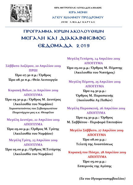 Παραθέτουμε το Πρόγραμμα Ακολουθιών Μεγάλης Εβδομάδος και Πάσχα 2019 στην Ιερά Μονή Αγίου Ιωάννου στο Λιβάδι της Ιεράς Μητροπόλεως Λευκάδος και Ιθάκης: