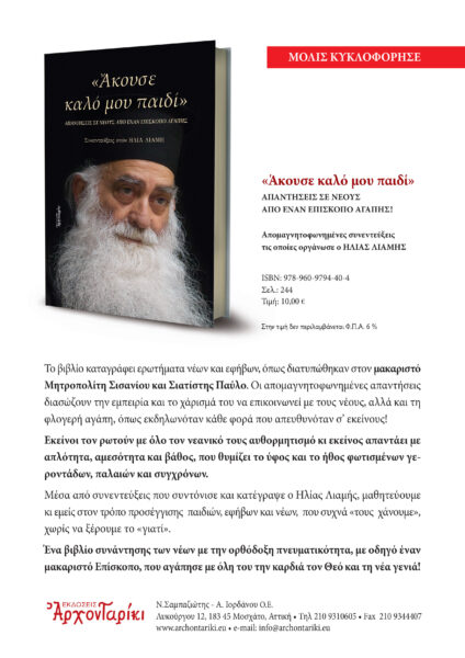 Μόλις κυκλοφόρησε το βιβλίο υπό τον τίτλο “Άκουσε καλό μου παιδί – ΑΠΑΝΤΗΣΕΙΣ ΣΕ ΝΕΟΥΣ ΑΠΟ ΕΝΑΝ ΕΠΙΣΚΟΠΟ ΤΗΣ ΑΓΑΠΗΣ”, όπου καταγράφονται ερωτήματα, όπως διατυπώθηκαν στον μακαριστό Μητροπολίτη Σισανίου και Σιατίστης Παύλο, περιλαμβάνοντας απομαγνητοφωνημένες συνεντεύξεις, τις οποίες οργάνωσε ο Ηλία Λιαμής.
