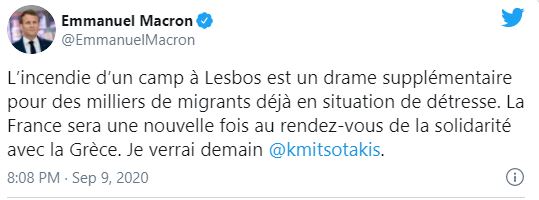 Την αλληλεγγύη της Γαλλίας στην Ελλάδα σχετικά με την πυρκαγιά στη Μόρια, εξέφρασε ο Γάλλος Πρόεδρος Εμανουέλ Μακρόν. «Η πυρκαγιά σε έναν καταυλισμό στη Λέσβο είναι μια πρόσθετη τραγωδία για τους χιλιάδες μετανάστες που ήταν ήδη σε απελπιστική κατάσταση. Η Γαλλία θα είναι για άλλη μια φορά παρούσα στο ραντεβού της αλληλεγγύης με την Ελλάδα. Αύριο θα δω τον πρωθυπουργό Κυριάκο Μητσοτάκη» έγραψε στον προσωπικό του λογαριασμό στο Twitter ο Εμανουέλ Μακρόν.