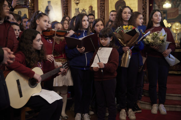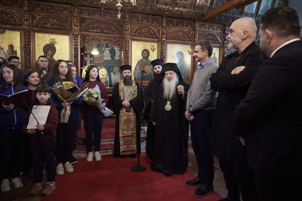 Μετά την επίσκεψη στο σχολείο, ο Πρωθυπουργός και ο κ. Ράμα μετέβησαν στον Ιερό Ναό Κοιμήσεως της Θεοτόκου, όπου τους υποδέχθηκαν ο Σεβασμιώτατος Μητροπολίτης Αργυροκάστρου κ. Δημήτριος και μαθητές του Σχολείου «Πνοή Αγάπης» της Ιεράς Μητρόπολης.