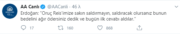 Ο Πρόεδρος της Τουρκίας μίλησε για την ένταση με την Ελλάδα στην Ανατολική Μεσόγειο, απευθυνόμενος προς τα μέλη του κόμματός του. Ο Ερντογάν, είπε: “Αν επιτεθείτε στο Oruç Reis, θα πληρώσετε βαρύ τίμημα”, εξαπολύοντας προφορική απειλή προς τους Έλληνες. Στο μεταξύ, ο πρόεδρος της Τουρκίας και η καγκελάριος της Γερμανίας Άγγελα Μέρκελ είχαν συζητήσει νωρίτερα τηλεφωνικά, όπως έγινε γνωστό σε επίσημη ανακοίνωση της Διεύθυνσης Επικοινωνιών της Τουρκίας. Κατά τη διάρκεια της συνομιλίας τους, ο Ερντογάν, παρά τις παραπάνω απειλητικές δηλώσεις του, υπογράμμισε ότι η Τουρκία πιστεύει στην επίλυση των προβλημάτων στην Ανατολική Μεσόγειο υπό το διεθνές δίκαιο, στη βάση του διαλόγου και της ισότητας, όπως μετέδωσε το πρακτορείο ειδήσεων Anadolu.