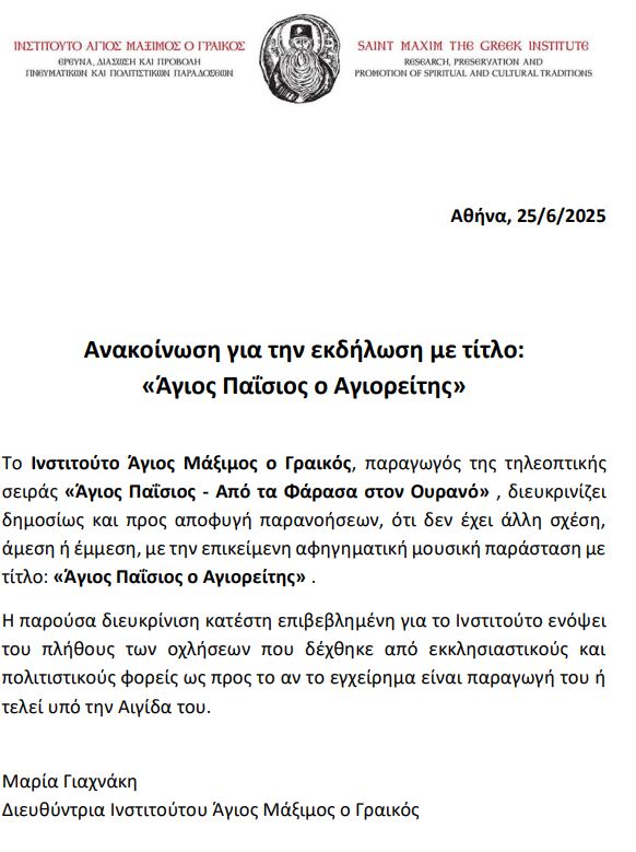 25/06/2025 25/06/2025 Το Ινστιτούτο Άγιος Μάξιμος ο Γραικός, παραγωγός της τηλεοπτικής ιστορικής, βιογραφικής σειράς «Άγιος Παΐσιος: Από τα Φάρασα στον Ουρανό», διευκρινίζει ότι δεν έχει άλλη σχέση, άμεση ή έμμεση, με την επικείμενη αφηγηματική μουσική παράσταση που φέρει τον τίτλο «Άγιος Παΐσιος ο Αγιορείτης». Όπως διευκρινίζεται, μόνο η πολυβραβευμένη τηλεοπτική σειρά «Άγιος Παΐσιος: Από τα Φάρασα στον...