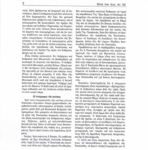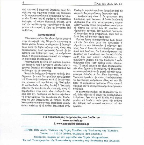 «Η Εκκλησία αρνείται ότι είναι αξιοπρεπές για τον κεκοιμημένο άνθρωπο να καεί σε κλίβανο και να θρυμματισθεί σε μίξερ», αναφέρει σε άλλο σημείο το φυλλάδιο.