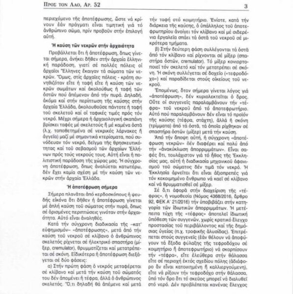 Στο φυλλάδιο αποτυπώνεται η αρνητική θέση της Εκκλησίας στην αποτέφρωση των νεκρών ενώ περιγράφονται τα στάδια της αποτέφρωσης, καύση -κονιορτοποίηση ανθρώπινου σκελετού, αναφέροντας πως η πρακτική αυτή «δεν διαφέρει και πολύ από την ανακύκλωση απορριμμάτων».