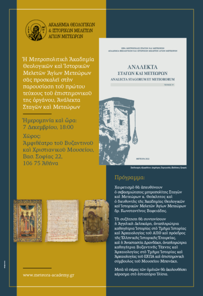 Παρουσίαση του πρώτου τεύχους του επιστημονικού της οργάνου Ανάλεκτα Σταγών και Μετεώρων διοργανώνει η Μητροπολιτική Ακαδημία Θεολογικών και Ιστορικών Μελετών Αγίων Μετεώρων.