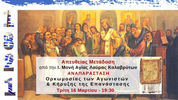 Δείτε σε απευθείας σύνδεση την αναπαράσταση της ορκωμοσίας των αγωνιστών για την κήρυξη της Επανάστασης του 1821 από το διαδικτυακό περιοδικό Πεμπτουσία (www.pemptousia.gr) και το Διεθνές Πρακτορείο Ορθοδοξία (www.ope.gr) την Τρίτη 16 Μαρτίου 2021 στις 19:30.