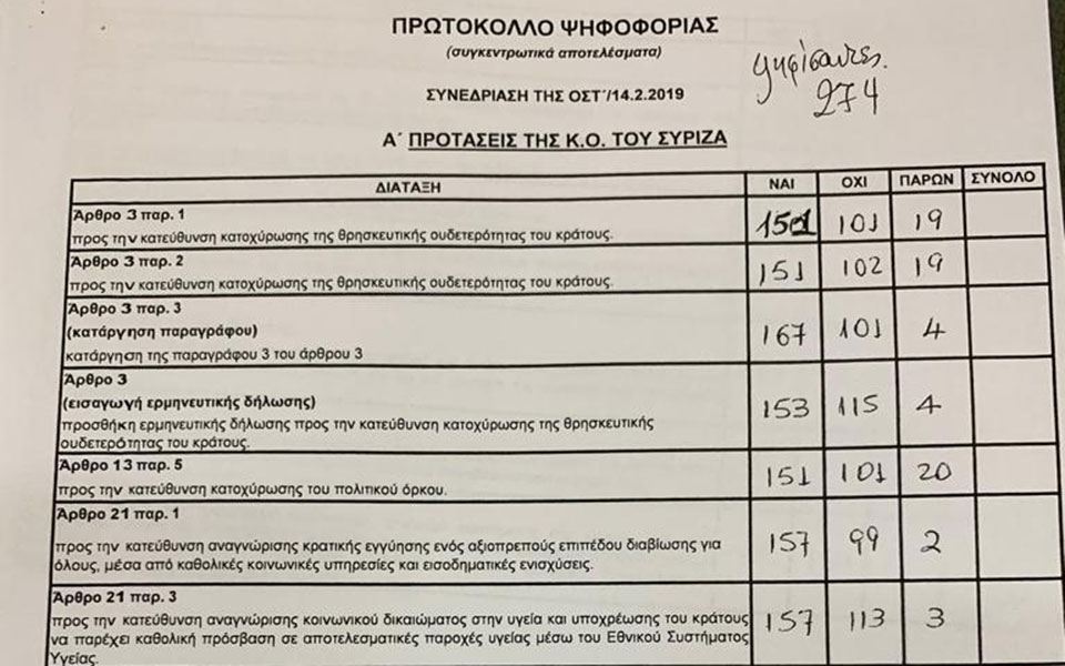 Αναθεωρητέο κρίθηκε το άρθρο 3 του Συντάγματος που καθορίζει τις σχέσεις πολιτείας- εκκλησίας καθώς, σύμφωνα με τα αποτελέσματα που ανακοίνωσε ο πρόεδρος της Βουλής Νίκος Βούτσης, συγκέντρωσε την πλειοψηφία έστω και οριακά .