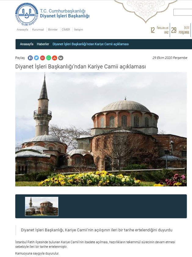 Ο Αλί Ερμπάς, σε ανάρτησή του με τη φωτογραφία της Ιεράς Μονής της Χώρας, που την αποκαλεί «Καριγιέ Τζαμί», αναφέρει ότι αποφασίστηκε να ανοίξει ξανά για λατρεία την Παρασκευή, 30 Οκτωβρίου.