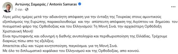 «Απαιτείται εδώ και τώρα κινητοποίηση, παγκόσμια, για τη Μονή Σινά» τονίζει, μεταξύ άλλων, ο πρώην Πρωθυπουργός Αντώνης Σαμαράς σε μήνυμα του για το θέμα που έχει ανακύψει ύστερα από τη χθεσινή απόφαση Εφετείου της Αιγύπτου αναφορικά με το καθεστώς και την περιουσία της ιστορικής Ιεράς Μονής Αγίας Αικατερίνης Σινά, την οποία χαρακτηρίζει «πνευματικό φάρο της Ορθοδοξίας και του Ελληνισμού».