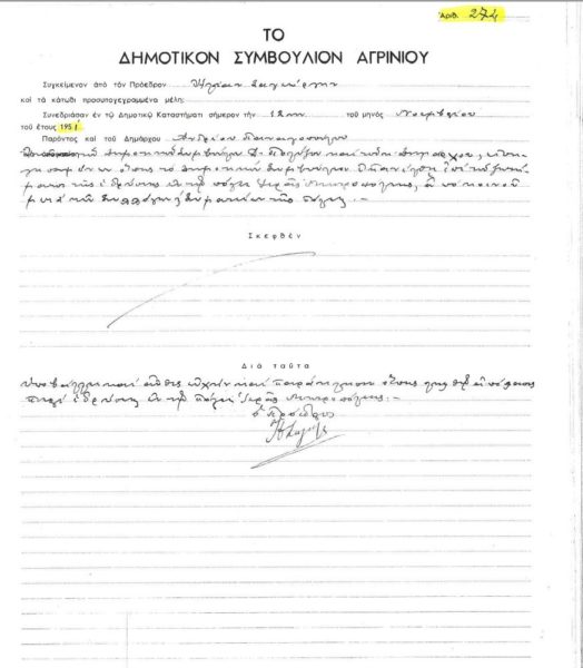 Δείτε την απόφαση του δημοτικού συμβουλίου Αγρινίου το 1951, όπως την δημοσιεύει το agrinionews.gr: