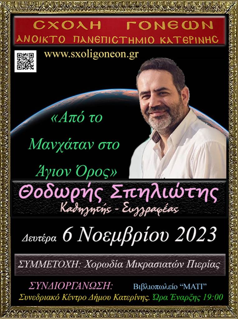 Την Δευτέρα 6 Νοεμβρίου 2023 στις 19:00, o καθηγητής – συγγραφέας Θοδωρής Σπηλιώτης θα παρουσιάσει στη Σχολή Γονέων Ανοικτό – Πανεπιστήμιο Κατερίνης την εκπληκτική αλλαγή στη ζωή του, ενός “Golden boy” της εποχής του, που τα είχε όλα και τα άφησε όλα για να μονάσει στο Άγιον Όρος! Οι ανατροπές, οι εκπλήξεις και οι συγκινήσεις που επιφυλάσσει είναι σε μικροκλίμακα ο ορισμός της ανθρώπινης ζωής. Και αν κάτι φιλοδοξεί να πετύχει η καταγραφή αυτής της προσωπικής ιστορίας, είναι ακριβώς να εμπνεύσει στους αναγνώστες της το θάρρος να ζουν τη ζωή τους όπως τους υπαγορεύει η καρδιά και ο λογισμός τους. Το θέμα της εκδήλωσης είναι: «Από το Μανχάταν στο Άγιον Όρος».