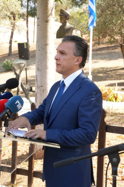 “Με ευλάβεια, περηφάνεια και βαθύτατο σεβασμό τιμούμε και καταθέτουμε σήμερα για άλλη μια φορά την αιώνια αγάπη και ευγνωμοσύνη μας στην αθάνατη μορφή του αξεπέραστου ήρωα των ηρώων της κυπριακής γης, του αθάνατου των αθανάτων, του θρυλικού υπαρχηγού του επικού αγώνα της ΕΟΚΑ, του «Σταυραετού του Μαχαιρά», Γρηγόρη Πιερή Αυξεντίου”, ανέφερε στον χαιρετισμό του ο Υπουργός Άμυνας της Κύπρου, Μιχάλης Γιωργάλλας.
