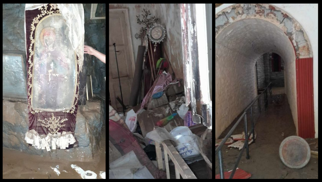 Η στάθμη του νερού είχε φτάσει σε μεγάλο επίπεδο εντός του ναού, ενώ στο μαγαζί που είναι λίγο πιο κάτω από την εκκλησία φαίνονταν μόνο οι σκεπές. Η πεζογέφυρα που οδηγεί στο Προσκύνημα δεν άντεξε και έσπασε.