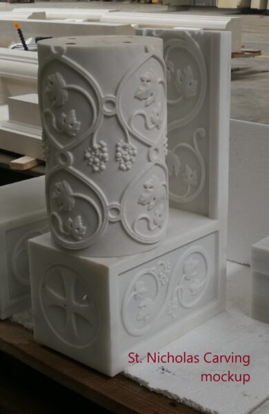 Ο Βαγγέλης Μαζιτζόγλου υπεύθυνος των μαρμαρικών εργασιών του ναού μιλώντας στο πρακτορείο Ορθοδοξία τονίζει ότι στον «Άγιο Νικόλαο θα χρησιμοποιηθεί ελληνικό μάρμαρο Διονύσου/Πεντέλης όπως και στον Παρθενώνα. Οι ποσότητες είναι σχετικά μικρές και τις έχουμε ήδη προμηθεύσει».
