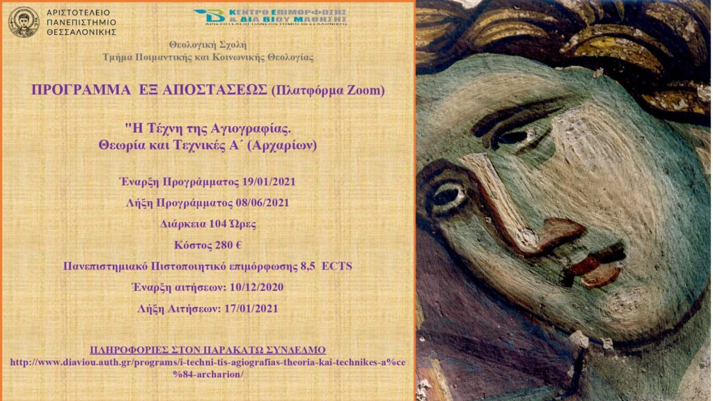 Το Κέντρο Επιμόρφωσης και Διά Βίου Μάθησης (ΚΕΔΙΒΙΜ) του Αριστοτελείου Πανεπιστημίου Θεσσαλονίκης (ΑΠΘ) ενημέρωσε για το εκπαιδευτικό πρόγραμμα με τίτλο «Η Τέχνη της Αγιογραφίας. Θεωρία και Τεχνικές Α΄ (Αρχαρίων)», διάρκειας έξι μηνών (διδακτικές ώρες 104), το οποίο, λόγω συγκυρίας, θα διεξαχθεί διαδικτυακά και θα υλοποιηθεί με τη μέθοδο της σύγχρονης εξ αποστάσεως εκπαίδευσης(μέσω της πλατφόρμας Zoom).