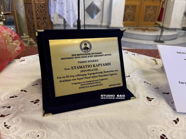 Στον κατάμεστο Ιερό Ναό του Αγίου Νικολάου στο Άργος πραγματοποιήθηκε χθες το απόγευμα, Σάββατο 29 Απριλίου 2023, τιμητική εκδήλωση για τον Πρωτοψάλτη κ. Σταμάτη Καρυάμη, με την ευκαιρία της συμπλήρωσης 56 ετών ευδόκιμης ιεροψαλτικής διακονίας.