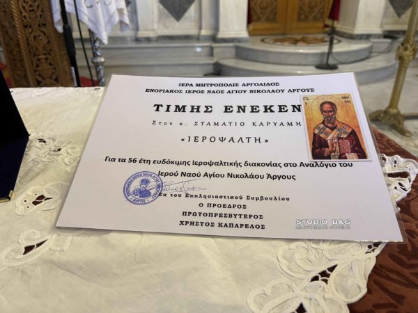 Άργος -Τιμητική εκδήλωση για τον Πρωτοψάλτη Σταμάτη Καρυάμη για τα 56 έτη Ιεροψαλτικής Διακονίας