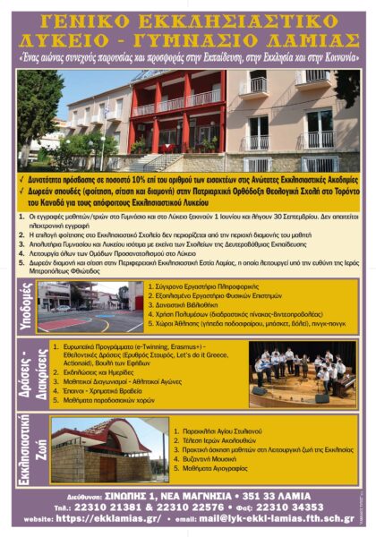 Το Γενικό Εκκλησιαστικό Λύκειο – Γυμνάσιο Λαμίας, Σχολείο το οποίο ανήκει στο Υπουργείο Παιδείας και Θρησκευμάτων και είναι ισότιμο με όλα τα Γυμνάσια και Λύκεια της Δημόσιας Δευτεροβάθμιας Εκπαίδευσης της χώρας μας, καλεί μαθητές και μαθήτριες προς εγγραφή σε όλες τις τάξεις Γυμνασίου και Λυκείου για το επόμενο σχολικό έτος, 2020-2021.