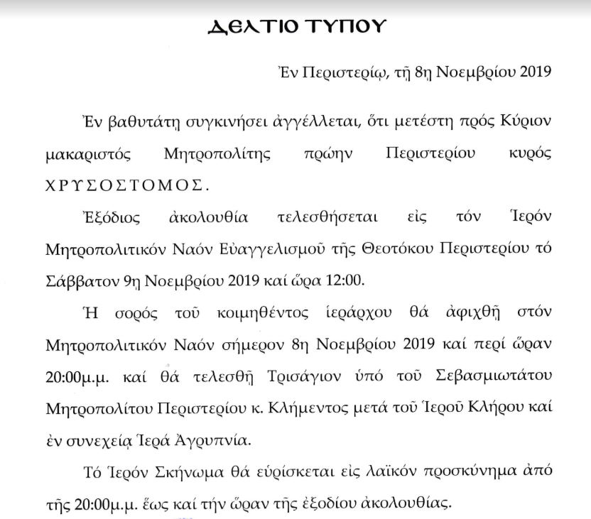 Αύριο Σάββατο στις 12 το μεσημέρι, αναμένεται να ψαλεί η εξόδιος ακολουθία του Μητροπολίτου πρώην Περιστερίου κυρού Χρυσοστόμου, η οποίος εκοιμήθη χθες το απόγευμα. Την εξόδιο ακολουθία θα τελέσει ο Αρχιεπίσκοπος Αθηνών και Πάσης Ελλάδος κ. Ιερώνυμος.