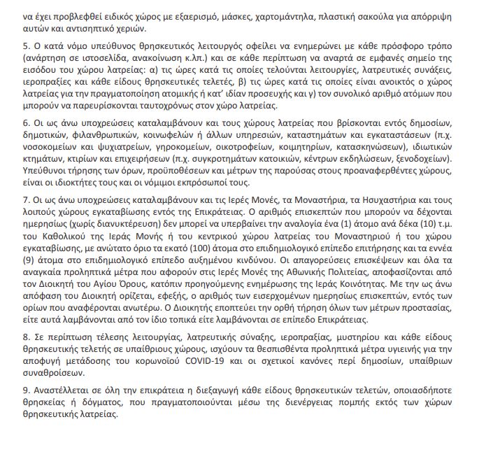 Ειδικότερα για Θεσσαλονίκη και Σέρρες και για 14 ημέρες αναστέλλεται η τέλεση, με την παρουσία φυσικών προσώπων και με την επιφύλαξη της παρ. 2, κάθε είδους λειτουργιών, λατρευτικών συνάξεων, ιεροπραξιών και πάσης φύσεως θρησκευτικών τελετών σε όλους ανεξαιρέτως τους χώρους θρησκευτικής λατρείας (κάθε είδους και κάθε νομικού, κανονικού και εν γένει θρησκευτικού καθεστώτος ναών και παρεκκλησίων, ευκτηρίων οίκων, τεμενών, συναγωγών κ.λπ.) κάθε δόγματος και θρησκείας, ανεξαρτήτως μεγέθους και χωρητικότητάς τους.