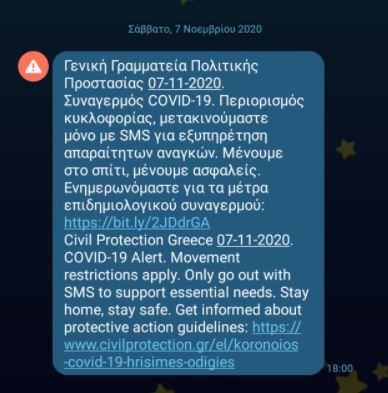 Μήνυμα απέστειλλε η Γενική Γραμματεία Πολιτικής Προστασίας (07-11-2020) προς όλα τα κινητά τηλέφωνα, με σχετικές παραινέσεις και συνδέσμους οδηγιών για τις μετακινήσεις των πολιτών ένεκα της καραντίνας, η οποία ισχύει απο σήμερα Σάββατο έως τα τέλη Νοεμβρίου.