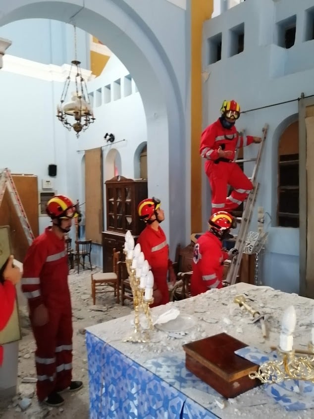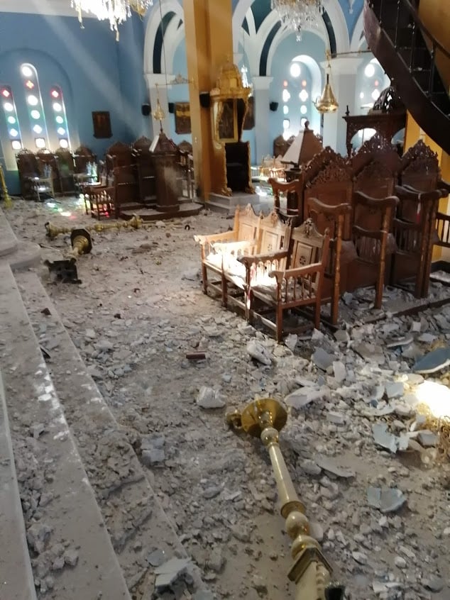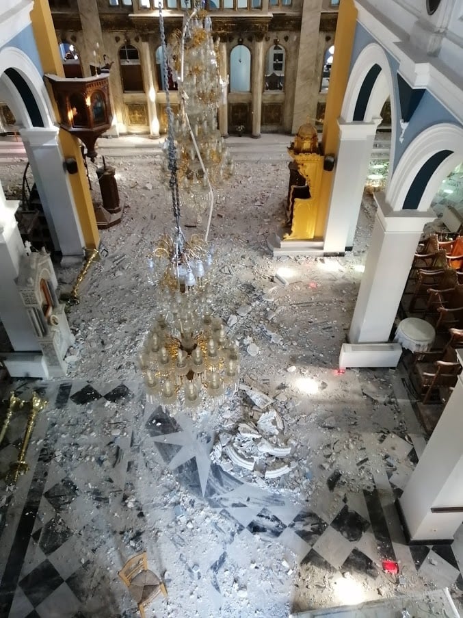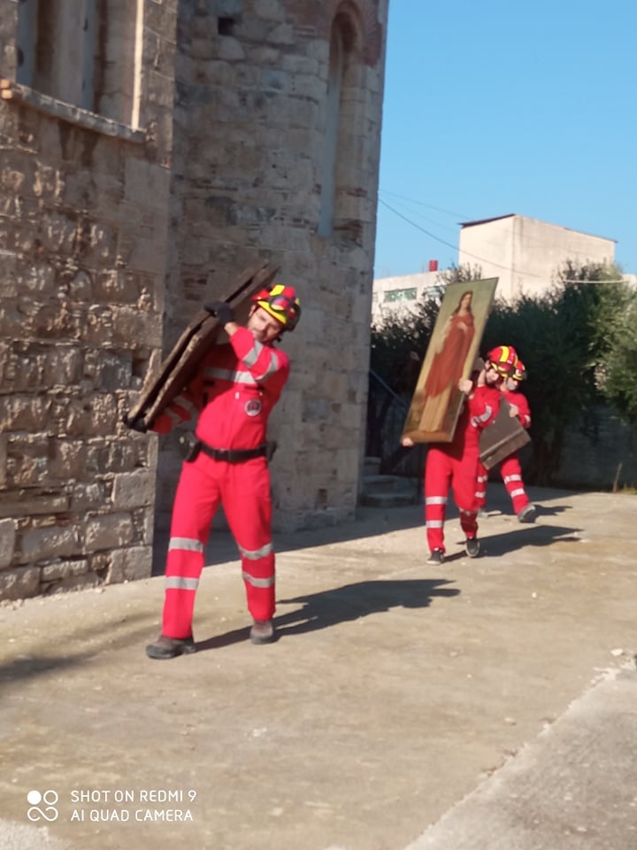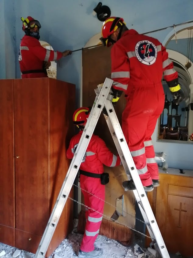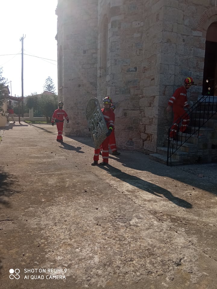 Εικόνες και ιερά κειμήλια από τον Ιερό Ναό των Εισοδίων της Θεοτόκου στο Μεσαίο Καρλόβασι της Σάμου, ο οποίος υπέστη εκτεταμένες ζημιές από τον καταστροφικό σεισμό, απομάκρυνε η  Ελληνική Ομάδα Διάσωσης, παράρτημα Σάμου.