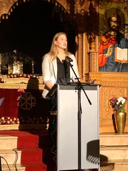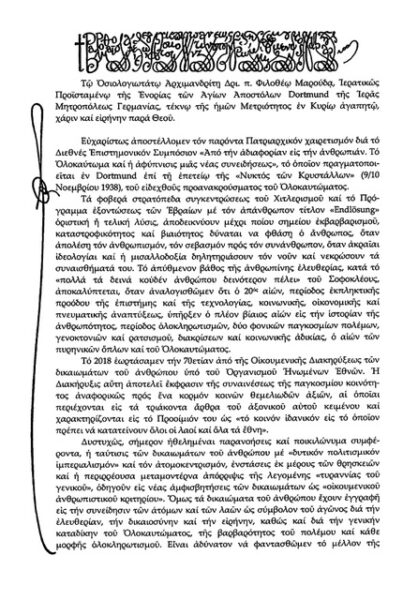 Μετά την ενός λεπτού σιγή που ετηρήθη εις μνήμην των θυμάτων της Νύκτας των Κρυστάλλων -της απαρχής των απάνθρωπων ναζιστικών θηριωδιών που κορυφώθηκαν με το ιστορικό Ολοκαύτωμα- με παράλληλη αφή φωτός και συσκοτισμό, καταλυτική ήταν η καταληκτική μαρτυρία της από τους γερμανούς προσηλύτους στην Ορθοδοξία, ενορίτισσας Χαριτίνης Huber η οποία ανεφέρθη βιωματικά στην οικογενειακή της ιστορία όπου στο Βερολίνο ο δικός της παππούς προστάτεψε στο υπόγειο του σπιτιού τους με άμεσο κίνδυνο ζωής ένα κυνηγημένο Εβραίο, θυμίζοντάς μας, όπως χαρακτηριστικά τόνισε και στις τρεις γλώσσες του Συνεδρίου ο π. Φιλόθεος ότι ΔΕΝ ήταν όλοι οι Γερμανοί ναζιστές, ΔΕΝ ήταν όλοι αντισημίτες, ΔΕΝ ήταν όλοι ρατσιστές. Και πως αυτήν την πλευρά της μυστικής γερμανικής φιλάνθρωπης αντίστασης στην απανθρωπιά θα πρέπει να αναδείξουμε και να της αποδώσουμε την πρέπουσα τιμή και καταχώρηση στην ιστορία.