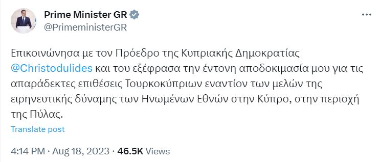 Διαβάστε επίσης: Τηλεφωνική επικοινωνία Μητσοτάκη με Χριστοδουλίδη για τα επεισόδια στη Νεκρή Ζώνη